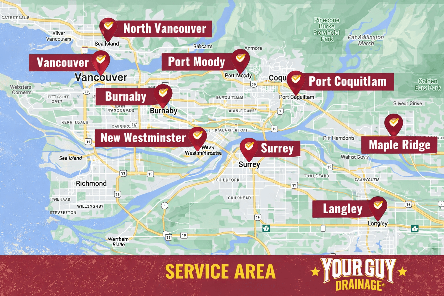 Your Guy Drainage proudly serves homeowners across the Lower Mainland, from the North Shore through Vancouver, Burnaby, and New Westminster, all the way to Surrey, Langley, and surrounding communities. No matter where you’re located, our team brings local drainage expertise and reliable solutions to protect your home and property.